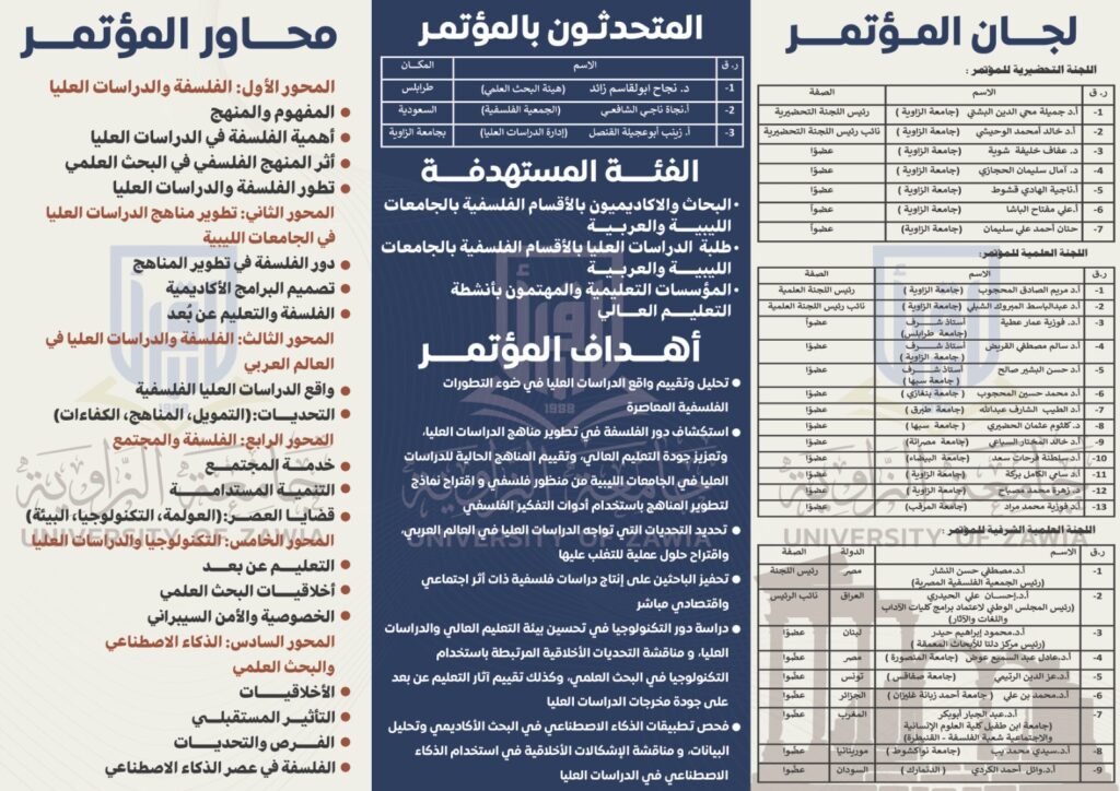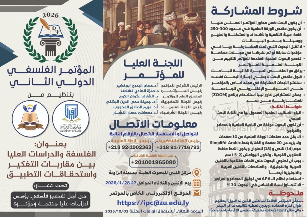 تحت شعار” من أجل تفكير فلسفي يؤسس لدراسات عليا منتجة ومؤثرة”، تنظم “جامعة الزاوية” في ليبيا المؤتمر الدولي الفلسفي الثاني بعنوان “الفلسفة والدراسات العليا بين مقاربات التفكير واستحقاقات التطبيق”، وذلك في مركز الليبي للبحوث الطبية بمدينة الزاوية يومي الإثنين والثلاثاء في 27 و 28 كانون الثاني 2026.