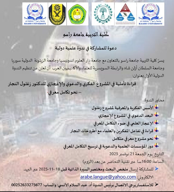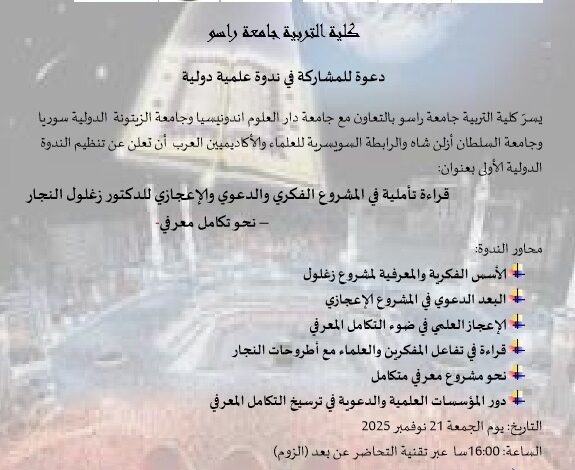 دعت كلية التربية في جامعة راسو، بالتعاون مع جامعة دار العلوم إندونيسيا، وجامعة الزيتونة الدولية سوريا، وجامعة السلطان أزلن شاه، والرابطة السويسرية للعلماء والأكاديميين العرإلى المشاركة في الندوة الدولية الأولى بعنوان “قراءة تأملية في المشروع الفكري والدعوي والإعجازي للدكتور زغلول النجار / نحو تكامل معرفي”، وذلك الساعة 16:00 يوم الجمعة 21 تشرين الثاني (نوفمبر) الجاري عبر تقنية التحاضر عن بعد (الزوم).